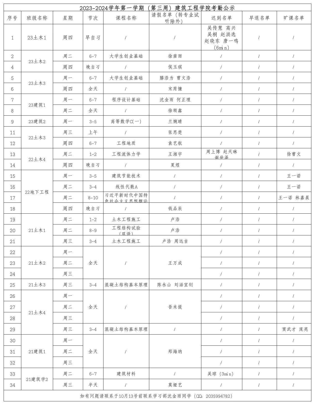 2023-2024学年第一学期(第三周)必赢76net线路考勤公示