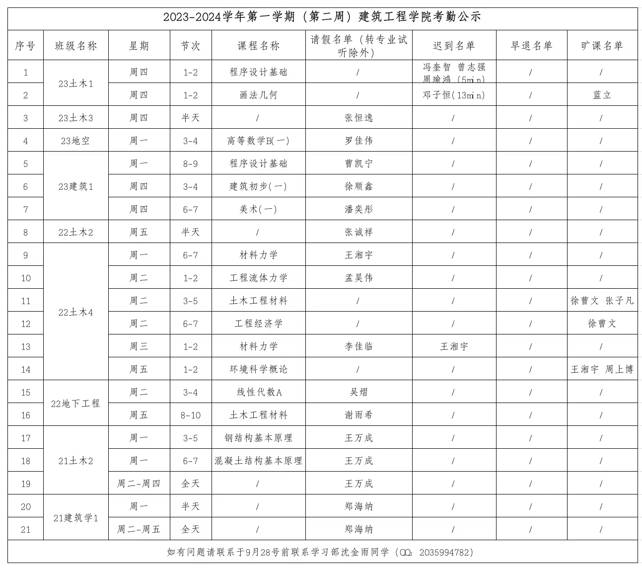 2023-2024学年第一学期(第二周)必赢76net线路考勤公示