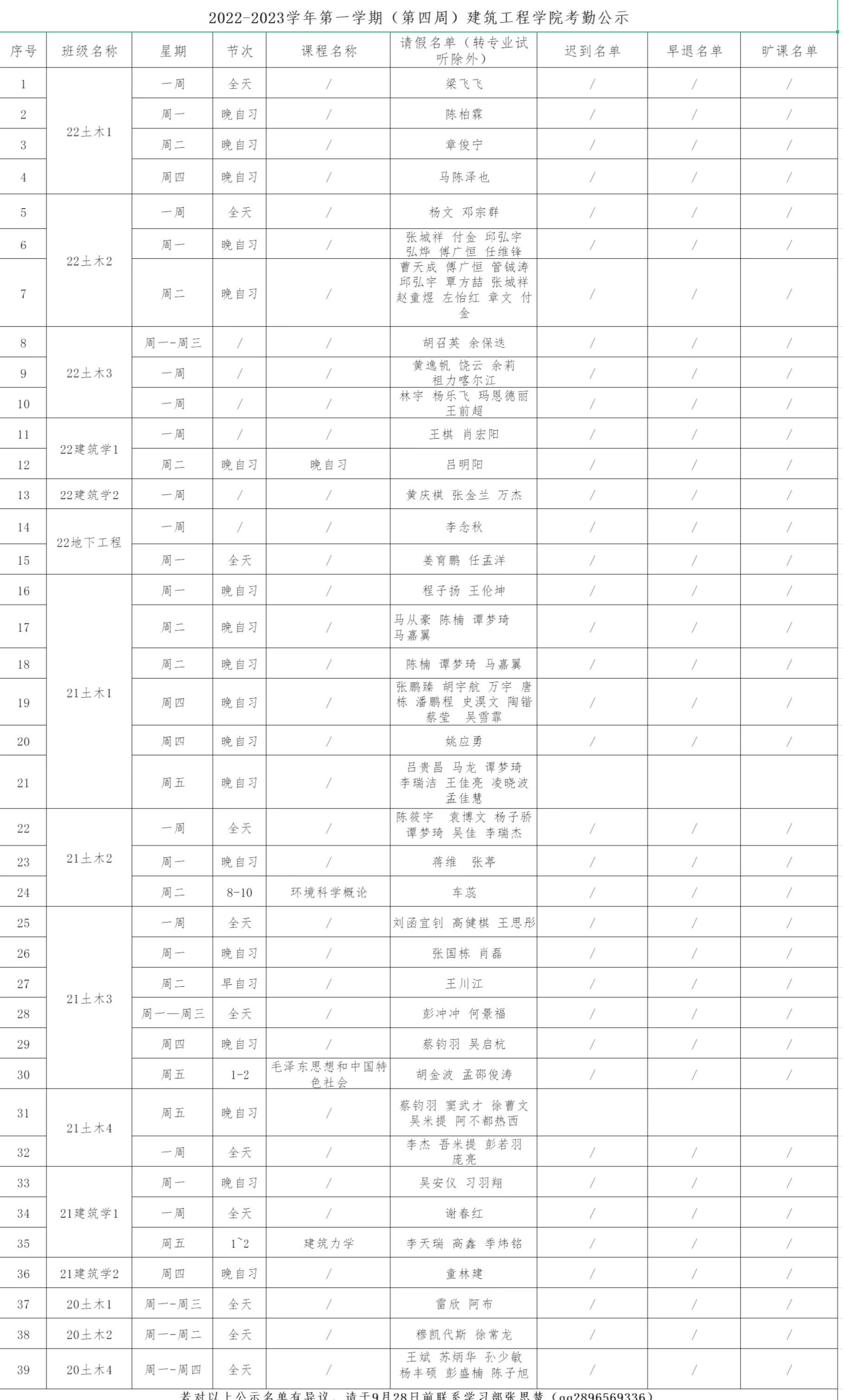 2022-2023学年第一学期(第四周)必赢76net线路考勤公示