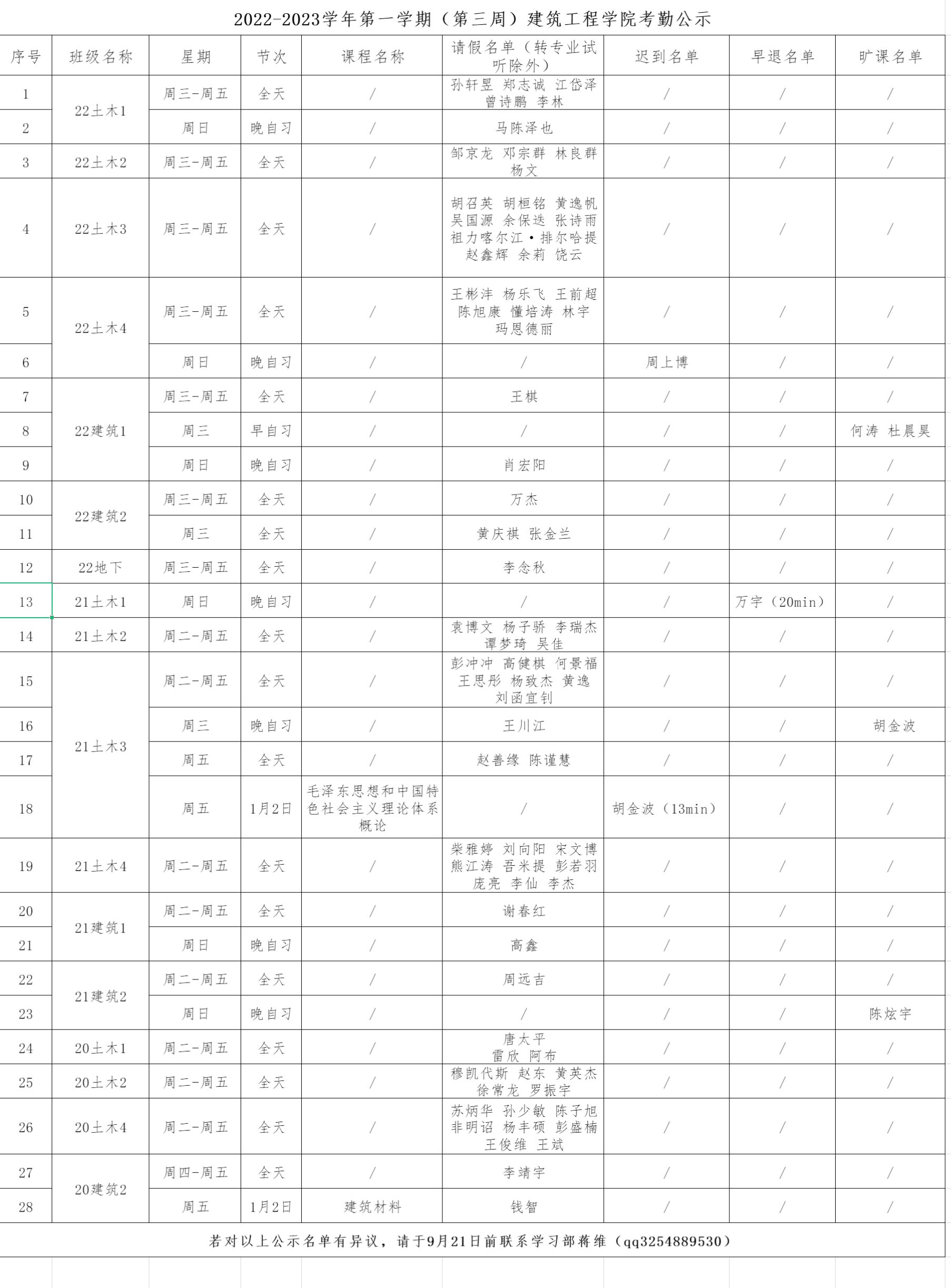 2022-2023学年第一学期(第三周)必赢76net线路考勤公示
