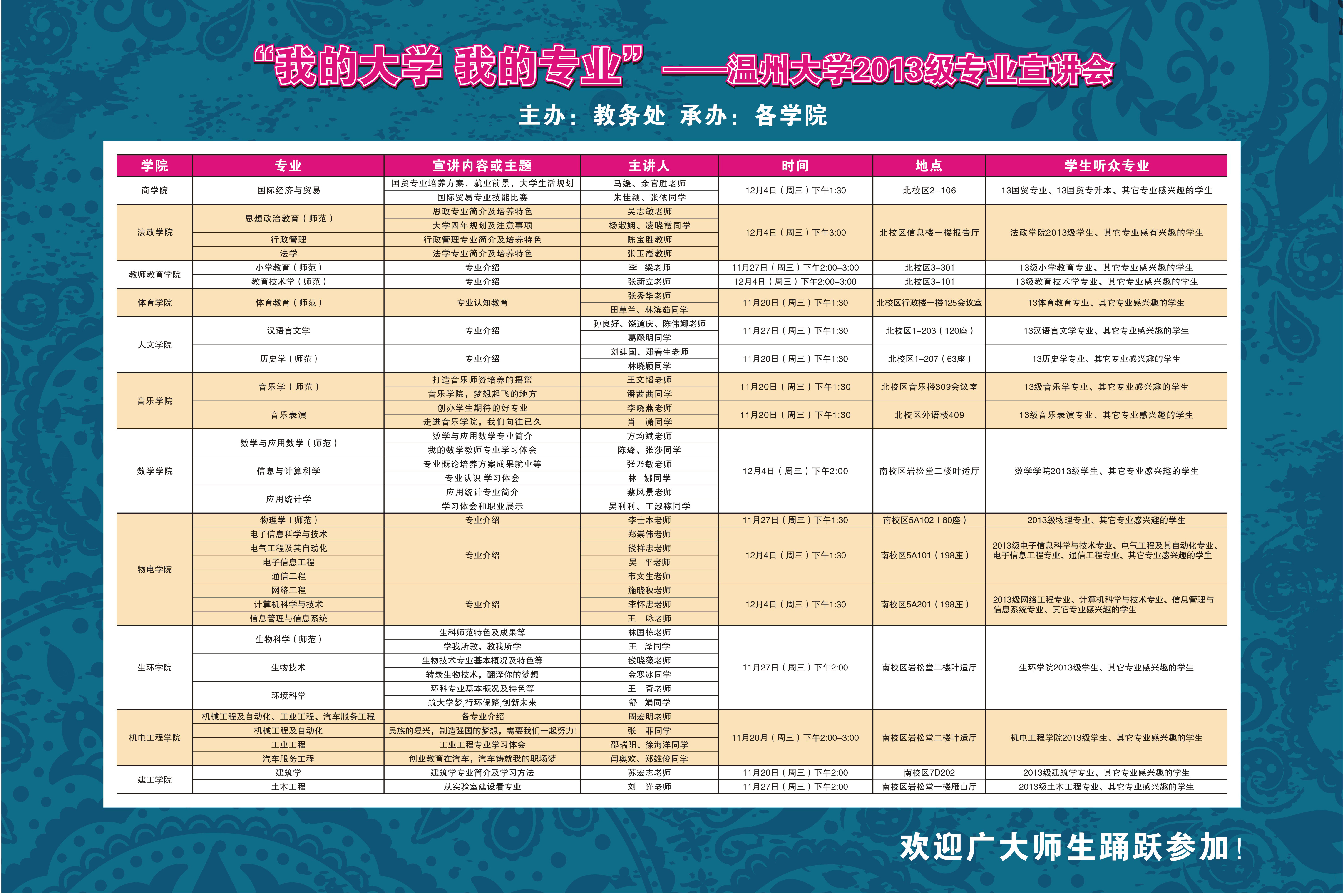 个专业向全校师生开放宣讲。欢迎广大师生踊跃参加!具体安排见附件: